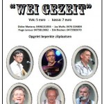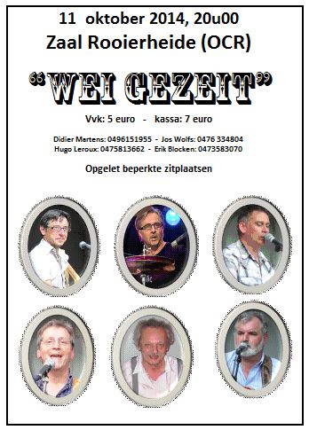 Zaterdag 11 oktober 2014 om 20.00 u kun je in het O.C Rooierheide gaan genieten van het muzikaal talent van de plaatselijke groep Wei Gezeit met amusementsmuziek van de bovenste plank van goede maar vergeten nummers. Voor de meesten onder ons zijn deze 6 muzikanten geen onbekenden, maar toch nog eens even voorstellen: bassist Didier Martens, zanger leadgitarist Erik Blokken, zanger gitarist Yvan Vesters, pianist synthesizer Hugo Leroux en zanger gitarist Jos Wolfs. drummer Marc Gijbels vervangt de vorige drummer Thierry Huygen, hij is geen onbekende in het muziekwereldje. Op het bluesfestival verving hij de drummer bij L’il Jimmy Reed, nam met de ganse familie deel aan Belgian,s got Talent (Familie Gijbels), speelt zelf in een bluesband en Drumt bij Accordiola +. Ambiance verzekerd. Vvk: 5 euro – kassa: 7 euro Didier Martens: 0496151955 – Jos Wolfs: 0476 334804 – Hugo Leroux: 0475813662- Erik Blocken: 0473583070 Opgelet beperkte zitplaatsen